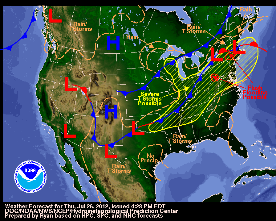 The long line of storms ran along a cold front, a normal occurrence during the summer. But why cold fronts? What about warm fronts? First, lets look at a radar/satellite image from this evening and compare it to a weather map from roughly the same time.