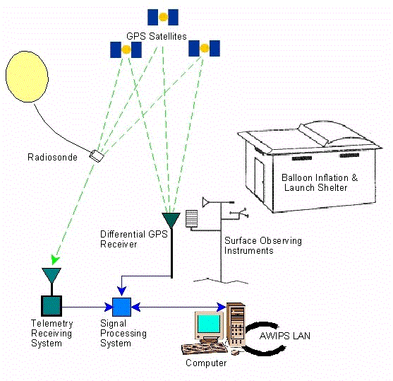 So how does the NWS get these vertical measurements? The answer is a radiosonde, an instrument package attached to a weather balloon. The radiosonde measures pressure, temperature, and relative humidity while antennae tracking the balloons calculate the wind speed and direction. Balloons are launched from dozens of installations each day, with NWS offices launching twice a day.