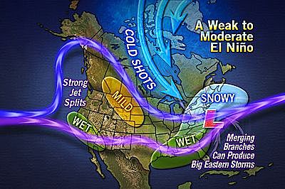 Both articles I introduced at the beginning of this post discuss El Nino. How exactly is it involved? The snowfall prediction we’ve already touched on, El Nino tends to cause a split in the jet stream over the North American continent. The point where they join typically sees large storms; and with incursions of Arctic air they’ll be snow storms that can dump large amounts of snow.