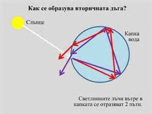 The path of light through a raindrop for the secondary rainbow. This path will also lead to a reversal in the color order for that rainbow. (Sorry about the Russian, it was the best image I could find.)
