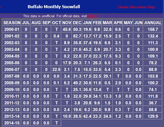 Thankfully, this kind of weather does not persist throughout the entire winter. Eventually, the lake will freeze over or at least get too cold for any significant convection. The timing of this varies from year to year but on average occurs sometime in January. Here’s Buffalo’s snow totals by month…