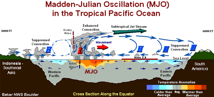 To understand how they occur we need to quickly go over the Madden-Julian Oscillation (MJO). The MJO is a climate pattern with a period between 1 and 3 months. We will not delve into the reasons for the MJO here, but its most important feature is the region of enhanced convection (thunderstorm, heavy rainfall activity) that moves west to east along the equator. Although the MJO pattern wraps around the entire planet, its effect is greatest in the Pacific Ocean.