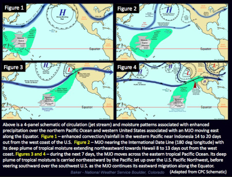 It is this region of thunderstorm activity that both triggers the Pineapple Express and is the source of its moisture. Below is the best visual explanation of the process I could find. The image is unfortunately small so I will explain it myself. The entire process takes between ten days and two weeks.