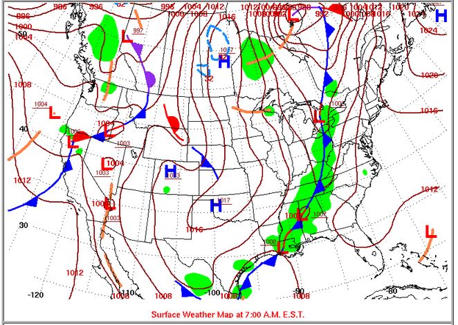 In the image above you can see a long cold front running from Canada to the Gulf of Mexico. The long, thin region of moisture is a dead giveaway. The orange region over the southern plains looks high pressure with cloudless skies.